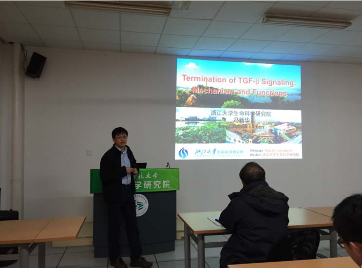 2016年12月22日上午,浙江大学校长特别助理、生命科学研究院院长冯新华教授应邀来bl韩漫 为广大教师做了题为“Termination of TGF-β Signaling: Mechanism and Functions”学术报告,邱猛生院长主持报告会。报告中,冯教授首先阐述了TGF-β信号通路在正常细胞中的作用,即PPM1A介导的去磷酸化和RanBP3/RanBP3L调控的出核转运协同作用,关闭了TGF-β信号通路;其次,冯教授阐述了TGF-β信号通路与癌症的关系,即在多种癌细胞中,多种类型的基因突变造成TGF-β信号通路的活性下降。报告内容非常精彩,与会的老师表现出浓厚兴趣,各自提出了自己关心的问题,现场气氛热烈。