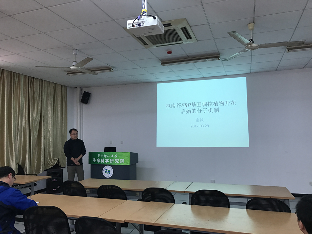 2017年3月29日下午,bl韩漫 在1号实验楼406举行了2017年生科院第一期学术论坛(生科论坛第5期)。论坛由薛大伟副院长主持,李斐雪副研究员和秦诚副研究员分别作了《Isl1在哺乳动物下颌形成中的遗传学功能》和《拟南芥FBP基因调控植物开花启始的分子机制》学术报告。学院20余位青年博士教师和研究生等参加论坛,与会人员提了许多科学问题,两位老师作了仔细解答,论坛在大家的讨论声中落下帷幕。