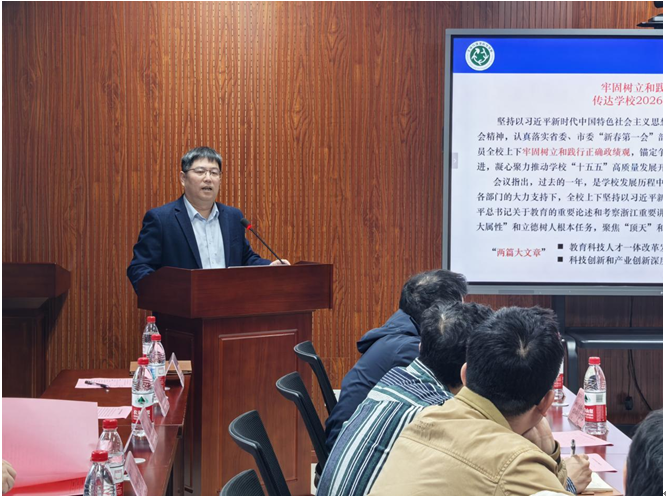 薛大伟院长全面传达学校2026年工作会议精神,结合学院办学实际、学科建设现状及师生发展实际,统筹研判办学攻坚重难点,精准部署学院2026年党政全域核心工作,压实全环节闭环落实工作责任。会议明确,全院全体教职工要全面对标学校年度核心战略部署,坚守立德树人根本核心使命,紧扣教育科技人才一体协同发展主线,锚定学院高质量内涵式提质发展总目标,重点抓实学科评估、学位点申报、教材建设、国家级学科竞赛、毕业生就业、重点科研项目攻坚、产学研成果转化、高层次人才精准引育、国际交流合作、十五五发展规划编制等重点专项工作,细化推进方案、压实岗位履职责任,统筹联动行政、教研、学工等各类岗位力量,聚力高质落地全年各项核心工作。同时,会议要求严守一岗双责,筑牢廉洁办学、安全办学底线,以严实高效的履职成效筑牢学院办学根基,稳步夯实学院核心学科竞争力。本次会议为学院下一阶段的高质量发展明确了路径、凝聚了共识。
